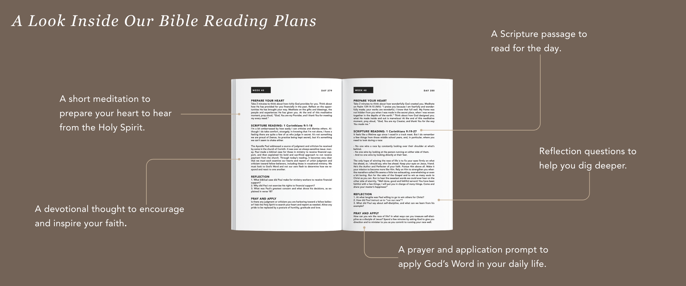 Each day of our Bible reading plans and devotionals are thoughtfully designed to help you linger in God’s Word, listen for the Spirit’s leading, and allow God’s truth to shape your heart, mind, and everyday life.